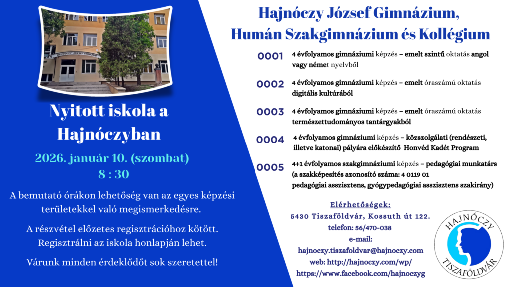 Iskolánk, a Hajnóczy József Gimnázium, Humán Szakgimnázium és Kollégium Jász-Nagykun-Szolnok megyében, a Tiszazug tájegység északi kapujának is nevezett Tiszaföldvár városában működik. A Kunszentmártoni járás egyetlen gimnáziuma, szervezetileg a Szolnoki Tankerületi Központhoz tartozó állami fenntartású köznevelési intézmény. Immár a 77. tanévet kezdtük meg 2023. szeptember 1-jén. Bár ez idő alatt rengeteget változott a világ, sok változást élt meg intézményünk, a hagyományokat hűen követjük és ápoljuk, s továbbra is valljuk, hogy az alapító tiszaföldvári polgárok céljait szem előtt tartva biztosítanunk kell a helyi és környékbeli diákok középfokú nevelés-oktatását, a sikeres érettségire és felvételire – felsőfokú továbbtanulásra vagy érettségire épülő szakképzésben való részvételre – felkészítést, az élethosszig tartó tanulás igényének és képességének kialakítását. Az elmúlt közel nyolc évtizedben generációk sora került ki e tiszaföldvári középiskolából. Többeknek gyermekei és unokái is itt kapnak érettségi bizonyítványt. Ahhoz, hogy ez a sikeres láncolat fennmaradjon és erősödjön, ma is megvan az intézmény pedagógusainak elhivatottsága, szakmai kompetenciája, emberi példamutatása és az a képessége, hogy a mai kor fiataljainak személyiségét jobbá formálja. A Hajnóczy olyan gimnázium, ahová a tanulók szívesen járnak tanulni, melynek szellemisége értéket közvetít, gondolkodni s az életben eligazodni megtanít, melynek légköre biztonságot nyújt, közössége erőt ad, elődeink és kortársaink munkájának megbecsülésével, a pozitív példák követésével, a jó „hajnóczys” hagyományok ápolásával rá alma materként hálásan és büszkén tekinthetünk.